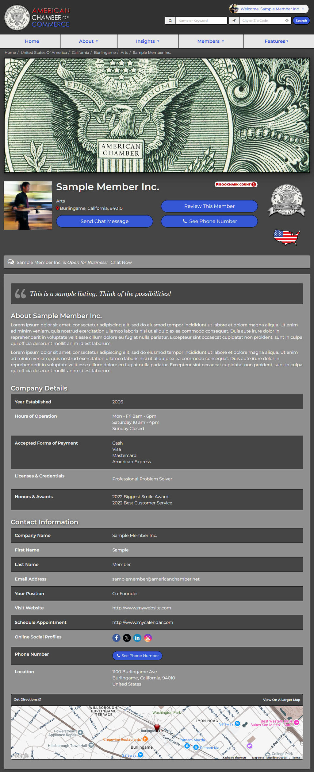 The network is a hybrid cross between your local little chamber of commerce and social media like LinkedIn. Chamber Members are legitimate business entities, not people; businesses located in the United States, US Territories and Tribal Lands.